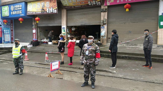 | 群众自觉间隔一米排队购买生活必需品 |