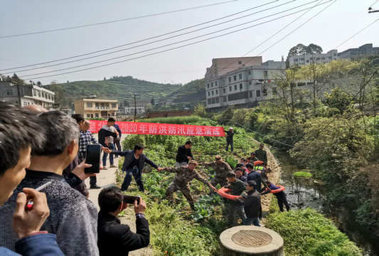 演练场景假设:汛期来临,雨量持续增大,皇华镇立即启动防汛应急预案,组织民兵队伍、水利巡管员、生态护林员、镇卫生院对漓水群众进行紧急救援、对低水位区域民众进行疏散转移,对溢洪区域进行填埋封堵。