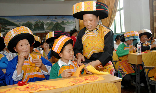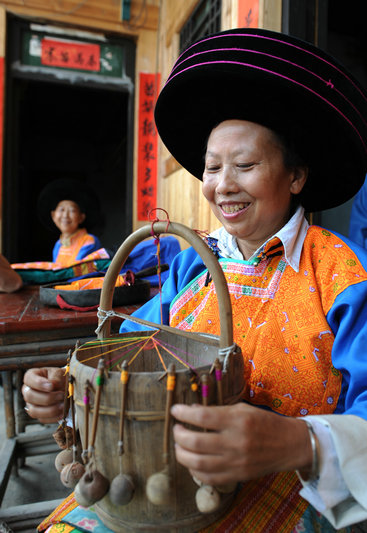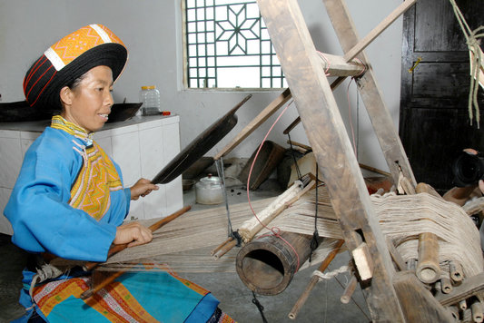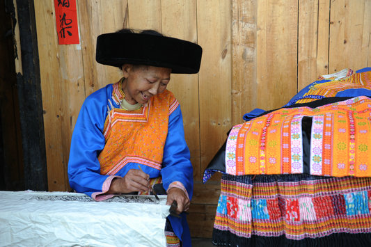 在古老的民族村中,民族工艺制品一直在传承和发展,刺绣、蜡染、织布、打花边是苗族制作服饰不可缺少的传统工艺,洁白无暇的布,心灵手巧的人,制出绚丽多姿的服饰,把苗家咪哆咪啋打扮得光彩靓丽。