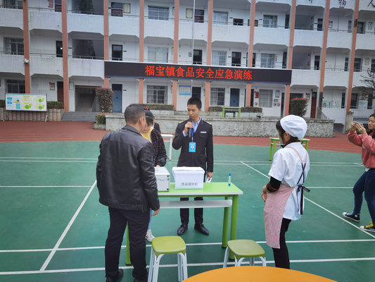 此次演练模拟福宝镇中心校5名学生食用了午餐后有恶心、呕吐、昏迷等症状,福宝镇政府、中心校、卫生院、派出所、市场监管所迅速反应,启动食品安全突发事件应急响应,相关部门迅速开展应急处置工作,现场模拟实施应急处置的过程。