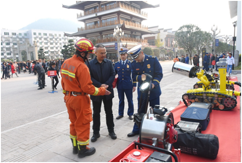 消防指战员熟练地向群众介绍了灭火侦查机器人、灭火器材、破拆器材、个人防护器材等着每一种消防器材的使用功能及范围,“琳琅满目”的消防器材吸引了大家的眼球,赢得了大家的称赞。在展区另一侧,灭火扑救体验区吸引了大批群众亲自体验灭火过程。消防指战员现场讲解相关消防知识以及灭火器材的使用方法。在场群众纷纷主动请缨,在消防员指导下,拿起灭火器对准火源根部喷射,油盆火随即被扑灭,整个环节群众参与度极高。