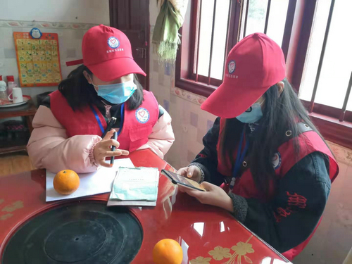 除了农户家里,在超市、场镇路口等处也能看见志愿者的身影,他们为路过群众讲解政策、测量体温、引导扫码。