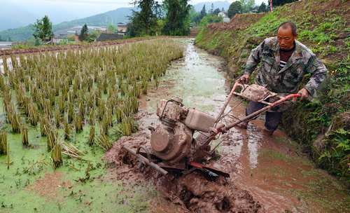 | 村民张亨尧正在用“铁牛”翻耕土地,原本板结的水田翻起“浪花” |