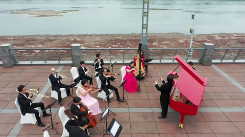 5月3日下午,在合江县城滨江音乐广场,乐队现场演奏了《长江之歌》《浏阳河》《我爱你中国》等中华经典名曲,指挥家激情澎湃,指挥酣畅淋漓。钢琴演奏如行云流水,指尖翻动处,悠扬的旋律如江河般自由地流淌,与由小提琴、大提琴、竖琴、管乐等配置精良的小型乐队合奏出和谐的乐章。