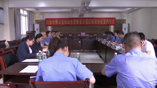 四川新闻网消息(张琳 顾杨 杜明珉 记者 程海英)为推动成渝地区双城经济圈一体化发展,加强川渝长江上游生态环境保护和自然资源保护司法协作,践行和传播山水林渔一体化保护和修复司法理念,提升公众生态法治意识,5月28日上午,川渝检察公益诉讼生态修复示范区框架协议签订会在重庆市江津区塘河镇举行,来自重庆市江津区和四川省合江县的六个单位一致同意启用“川渝检察公益诉讼生态修复示范区(塘河流域)”。