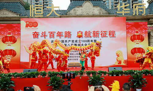 活动在《金龙飞舞迎七一》中拉开序幕,随着铿锵有力、热闹非凡的阵阵锣鼓声响起,着艳丽服装的舞者手舞长龙,翻腾起舞,如蛟龙出海、穿梭前进,又如龙游四海,腾飞云霄,让整个会场开始欢腾起来。