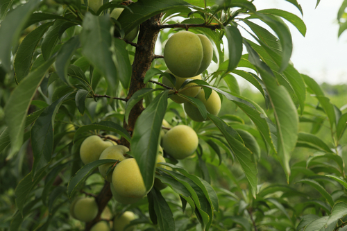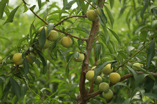 走进果园,翠绿的李树郁郁葱葱,连成一片,不少游客穿梭在李子林中体验采摘的乐趣。