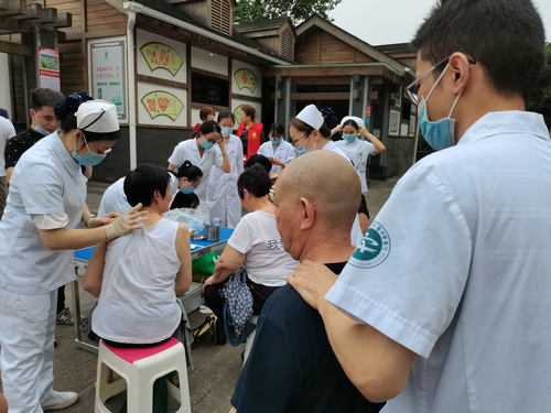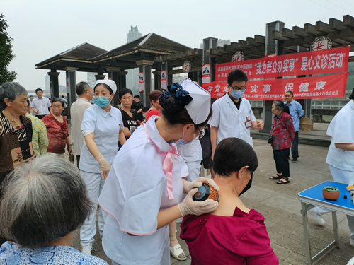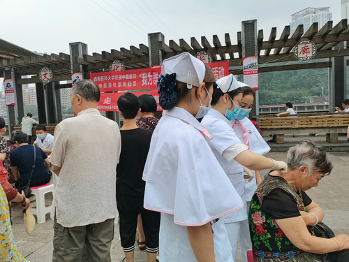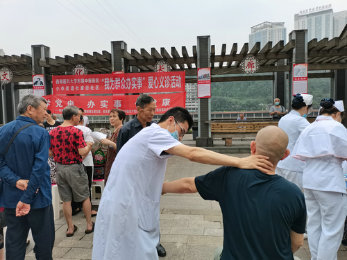 “老人家,收缩压160,舒张压80,上压有点偏高,要注意休息!”“嬢嬢,你平时注意不要提重物哦!”来自西南医科大的医生们耐心地为前来就诊的居民提出注意事项和日常保健等方面的建议,前来咨询的群众络绎不绝,医生们也激情满满。伴随着优扬悦耳的音乐,医生还讲解了八段锦的基本动作要领和练习技巧,讲述了掌握身形和领悟运气的先后顺序,居民们深受感染,情不自禁跟着医生一起练习起来。在广场的另一角,居民们排起长队有序地参加免费体验火龙罐、刮痧、颈肩按摩,感受中医传统特色护理,居民体验后连连称赞。“年龄大了行动不方便,医生都到家门口给我们免费看病了,还赠送养生香囊,党的政策就是好啊!”现场一位大爷感激地说。