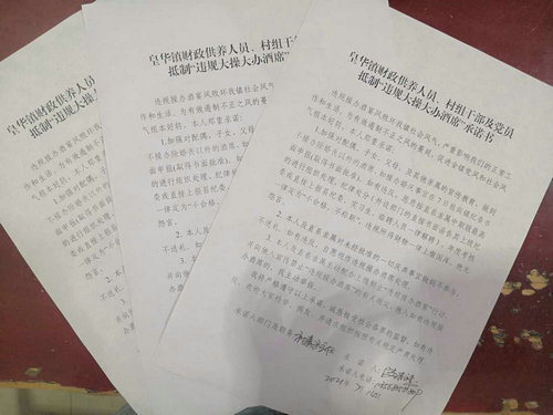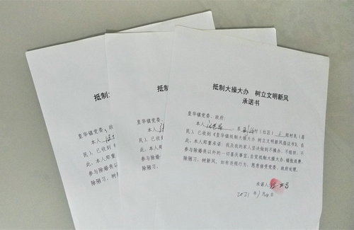 据了解,截至目前,皇华镇全镇已签署《抵制大操大办 树立文明新风承诺书》3000余份,《皇华镇财政供养人员、村组干部及党员抵制“违规大操大办酒席”承诺书》近400份,发放《皇华镇抵制大操大办 树立文明新风倡议书》3000余份。接下来,皇华镇将继续强力整治大操大办,为群众减轻负担;继续深入推进移风易俗,建设文明乡风。