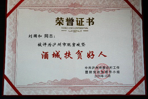 “涓涓细流,汇成江河;实现小我,终成大我”!2020年,刘国和获得“酒城扶贫好人”“扶贫济困先进个人”等荣誉称号。从泸州市扶贫基金分会会长伍福钊手中接过这份沉甸甸的荣誉证书,刘国和觉得6年多的帮扶没有白费。接续奋斗乡村振兴,自己还将发挥余热,献计献策、聚智汇力、主动服务,带动周边群众振兴乡村、共圆中国梦。