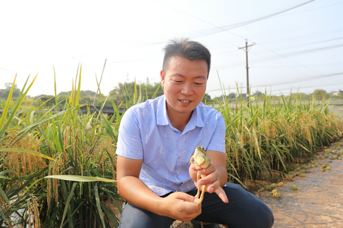 2018年10月,返乡青年曹洪浩在当地流转了30亩土地进行黑斑蛙养殖,先后投入40万余元。通过刻苦钻研、不断摸索,曹洪浩不仅学会了黑斑蛙繁育,还摸索出了一套成熟“稻蛙共生”立体种养模式。田里有稻,水中有蛙,一田双收,一年可收高品质水稻3500斤,亩产成蛙1500斤,年总产值40余万元。