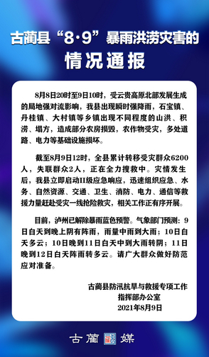 截至8月9日12时,全县累计转移受灾群众6200人,失联群众2人,正在全力搜救中。灾情发生后,古蔺县立即启动Ⅱ级应急响应,迅速组织应急、水务、自然资源、交通、卫生、消防、电力、通信等援救力量赶赴受灾一线抢险救灾,相关工作正有序开展。