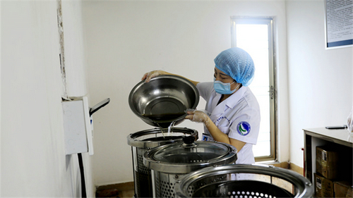 一大早,龙马潭区人民医院熬药室就沸气腾腾,浓郁的中药味充满整个熬药室,“每天要熬制30副中药,可供300余人服用。”龙马潭区人民医院药剂科科长曹荣告诉记者,每次熬制之前要先用冷水将中药浸泡,药材变软后,有效成分更容易被煎出。三十分钟后,再将浸泡的冷水一起倒入锅中熬制,效果更佳。