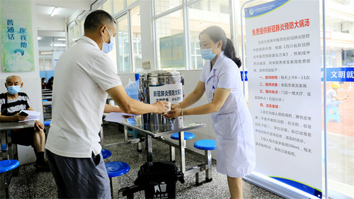 四川新闻网消息(韩孟君 记者 程海英)“我们医院熬制了预防新冠肺炎中药大锅汤,请大家排好队,免费领取。”8月12日,龙马潭区人民医院的医生正在门诊部大厅,为过往群众发放免费的预防新冠肺炎的汤药。