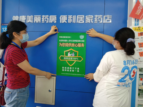 莲花池街道综合执法队及相关工作人员沿街逐一排查,对员工全部接种了新冠肺炎疫苗并按照要求做好了“扫描场所码、测量体温、佩戴口罩、人员登记”等疫情防控工作的店面、商铺等营业场所,主动为其张贴印有“接种达标100%”的绿色宣传标签。标签还印有:“尊敬的顾客您好,本店所有服务人员均已接种新冠肺炎疫苗,为您提供放心服务。”及相关接种新冠肺炎疫苗宣传标语。