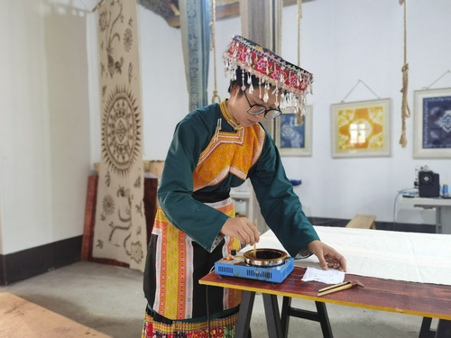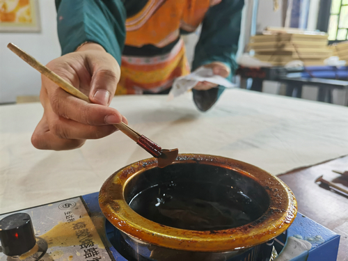 四川新闻网消息(涂伊莎 张磊 记者 程海英)踏进泸州市古蔺县箭竹苗族乡非遗体验基地,随处可见随风飘展的布匹,颜色介于篮和紫之间,却比蓝紫色更为厚重。一位苗家姑娘正用蜡刀蘸着熔蜡,一勾、一画、一绕、一点,画布上就出现了优美流畅的图案,细细望去,一副庆祝建党100周年的蜡画图初见雏形。