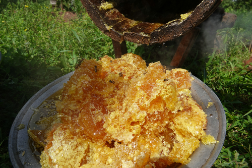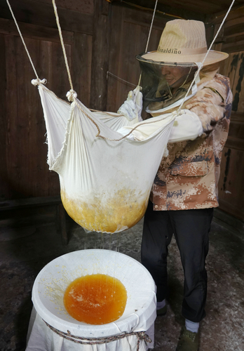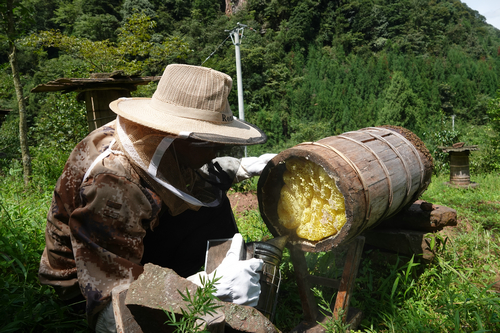 土生土长的熊楚湘采用的是传统古老的养蜂之法,以圆形蜂桶为“屋”,让蜜蜂蜗居此中,放野山林,采的全是百花之蜜。“龙爪蜜蜂是传统的散养方式,生存于原生态山野之中,蜜蜂采集深山里的上百种野山花酿造而成,酿蜜周期较长,一年只能取一次蜜,是蜜中极品,产量低,很难买到。”熊楚湘“收割”土蜂蜜的方法也很古老,他先把蜂桶盖子拿下来,再用烟将蜂桶里的蜜蜂熏出,待蜜蜂差不多都出来聚在蜂桶口后,再用勺子将蜂蜡挖下来。
