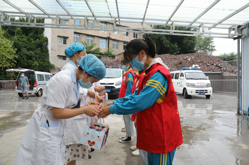 | 学生们将做好的月饼送给疫苗接种点的医护人员 |