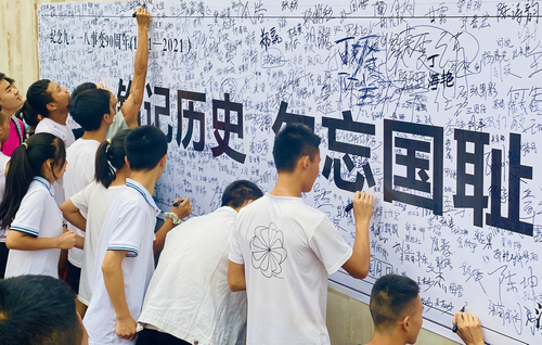 前车之鉴,后事之师,只有铭记历史,才能更好地砥砺前行。同学们来到 “铭记历史,勿忘国耻”的黑白色横幅前,用签字笔写下自己的名字,表达对侵略者的愤恨和对祖国的热爱之情。