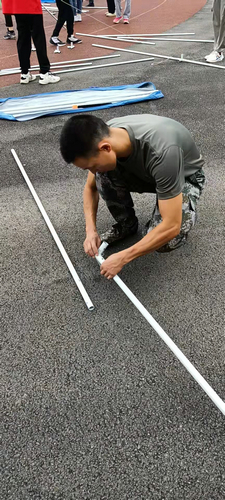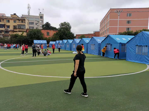 “先把帐篷杆穿好,再用力连接牢固,支架搭好后,我们再分别将篷布固定好,这样就基本完成了……”在安置点,对野外生存驾轻就熟的张应一边给大家讲解帐篷的搭建技巧,一边进行人员分工。“男生和我们一起合作搭帐篷,女生负责环境卫生,遇到困难就喊我来,大家一起加油!”帐篷陆陆续续运抵操场,来一顶帐篷张应就带领大家安装完成一顶。每一顶帐篷安装完成后,张应都细心地检查每一个细节,“我看了下天气,明后天都有暴雨,帐篷到时候没安好进水就麻烦了。”在张应同大家的共同努力下,80余顶帐篷迅速搭建完成并及时投入使用。