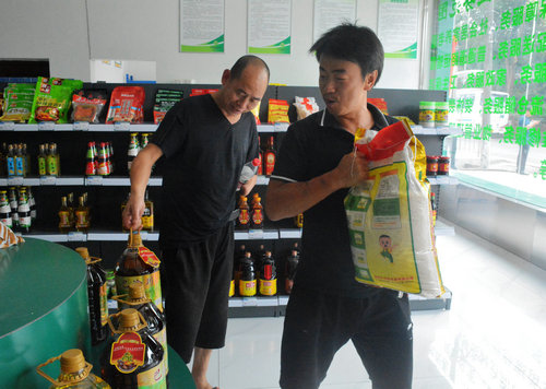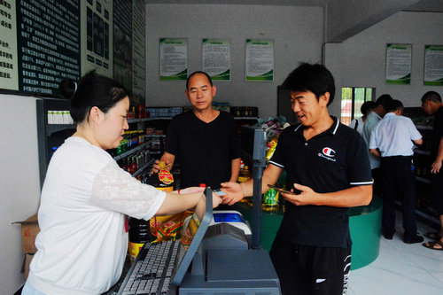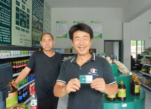 | 村民胡强拿着刚办理的“惠民连心卡”购物 |