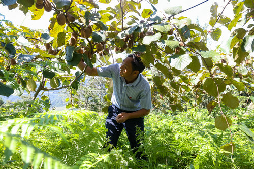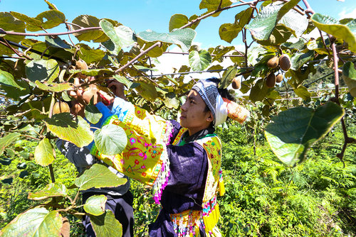 猕猴桃园空气清新、果香扑鼻,采摘的农户们享受着丰收的喜悦,开心不已。