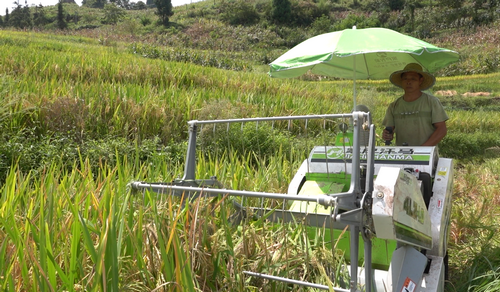 收割、脱粒、装袋一气呵成,新购置的收割机不仅省时省力,方便快捷,还操作简单,凤凰村村民姜清强很是满意。这台收割机不仅缓解了高山梯田水稻收割难的问题,也加快了高山水稻的收割进程。