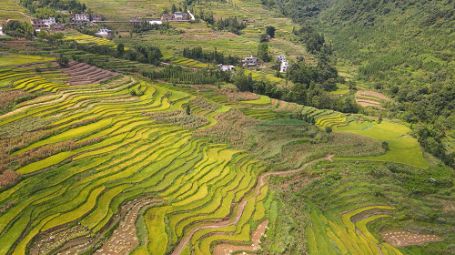 在德耀镇凤凰村,层层梯田稻浪起伏,顺着山势延绵不断,金黄的稻穗随风摇摆,诉说着丰收的喜悦,村里新引进的水稻收割机机器声轰鸣,让田间劳作的稻农们喜上眉梢。