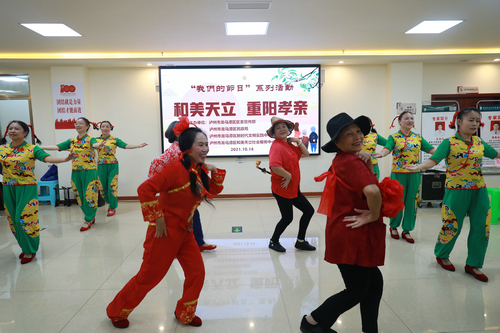 当日,该街道开展“合美天立,重阳孝亲”重阳节系列活动。在活动现场,70余名老年人组成志愿者队伍,共同诵读《弟子规》,社区文艺团队载歌载舞为老年人们表演节目,泸州市老年人书法协会成员挥毫泼墨,并赠送上“天道酬勤”“上善若水”等字画。老年人志愿者们为50余名80岁以上高龄老人按腰捶背,聊家常、讲健康,青年志愿者自发帮助老年人理发、剃须。此外,西南医科大学附属中医院医生到场义诊,帮助老年人测血压、中医诊疗、检查牙齿等。