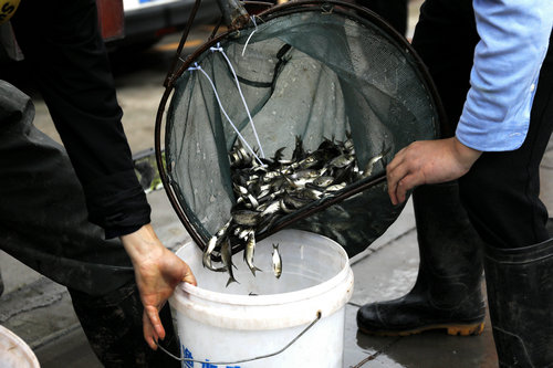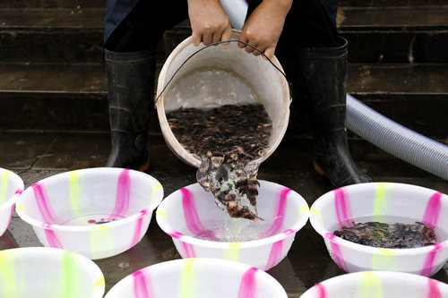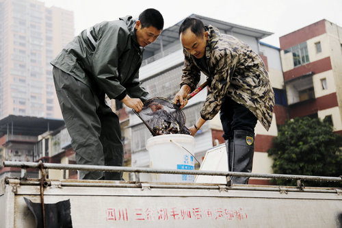 | 流放人员将鱼苗从运鱼车装进水桶 |
