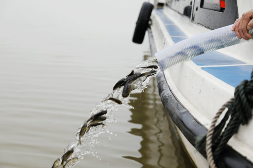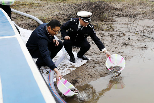 | 流放人员用鱼管将鱼苗“注入”河中 |