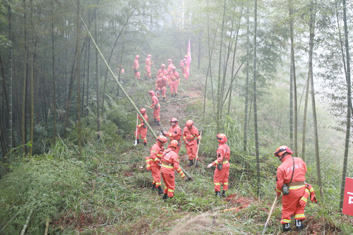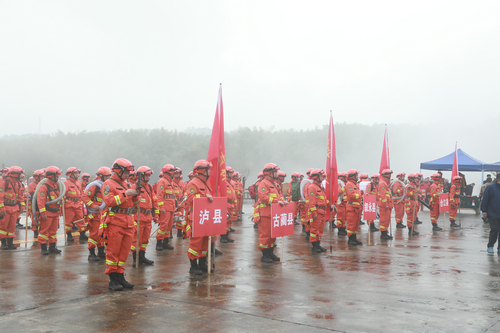 演练模拟合江县福宝国有林场烂田坝管护站出现森林火情,巡山人员及时报告,福宝国有林场立即启动专项扑火方案,迅速组织半专业扑火队员进行先期处置,并及时转移人员到安全地带。随着风向风速变化,火势逐渐增大,福宝国有林场扑火队员已无法控制,合江县立即请求增援,市森林防灭火指挥部调度泸县、叙永、古蔺国有林场半专业扑火队伍参与扑救。在了解分析火场具体情况后,福宝国有林场扑火队采用风力灭火机与二号工具配合的方式直接灭火,叙永国有林场扑火队负责采取以水灭火方式扑打东线明火,古蔺国有林场扑火队在北面距火线500米外开设隔离带,泸县国有林场扑火队负责保护东侧重要目标。经过科学扑救,扑灭了福宝国有林场森林火情,队员们有序撤离归建。