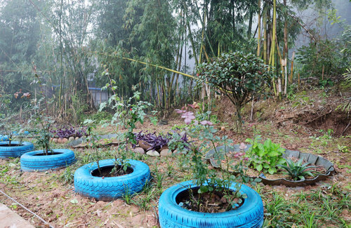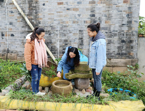 把村民不用的石磨打造成风景,在石磨上搭小桥,溪水从石磨盘中往下流入旁边的土陶罐,再在陶罐中种上荷花、莲子等水生植物,搭配上朽木做成的花篮、石头砌成的桌椅、石凳中长出的菠萝苗、一旁栽种的芭蕉树,一幅小景观就在原来的荒坡上应运而生。