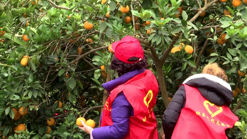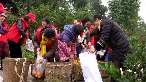 12月1日,在大桥镇黄包山村,一支30多人的“小红帽”志愿服务队忙活着采摘柑橘,这些柑橘是村民牟光尧和冯西成的,由于两人年事已高,子女在外务工,缺乏劳动力的他们眼看柑橘成熟,销售却犯了难。