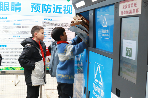 班会课结束,是愉快的营养校餐时间。用完餐后,学生们将纸盒整理收集起来,由每个班的小小垃圾收集员将垃圾带到学校的垃圾分类智能回收箱进行投放。小小垃圾收集员在志愿者的帮助下,点击屏幕、刷卡感应、投放垃圾,整个过程仅需12秒左右。投放结束后显示屏还会显示垃圾投放所获积分,“哇!我们班加了18分!”五年级李玥辰同学高兴地说。