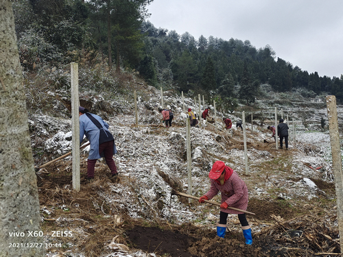 四川新闻网消息(周双远 记者 程海英/文图)走进泸州市古蔺县大村镇大村猕猴桃园区,不仅可以赏雪看景,还可以向现场劳作人员学挖窝、栽种、剪枝,种下一棵三年后果实累累的猕猴桃。虽然大雪纷飞,但村民的产业发展热情不减,整地、挖窝、栽桩、拉线、剪枝忙得热火朝天,为猕猴桃的成长争分夺秒,也为来年猕猴桃的丰收增产做充分准备。