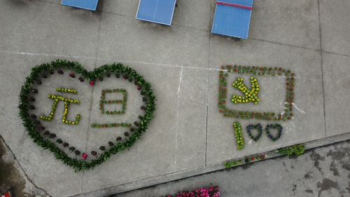 | 在安宁中心校内,学生们用花盆摆出了“元旦”“100”等字样 |