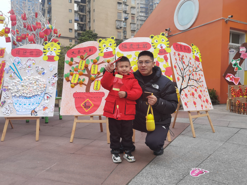 | 在玉带河幼儿园内,家长正同小朋友们一同在年味十足的新年摊位前合影 |