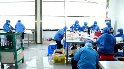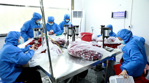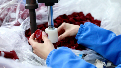 在长江村的一加工车间内,村民们身穿统一制服,佩戴口罩,一手盖帽一手用气缸压严,一个瓶盖就加工完成了。动作越快,干得越多,工资也会更高。