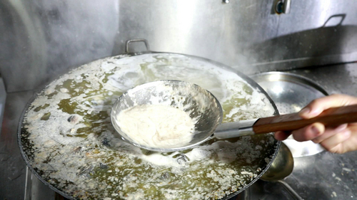 跑山乌骨鸡的鸡油和猪油放在一起熬制,放入生姜、花椒去腥,将大块的鸡肉翻炒过油,再加入周师傅的独家秘方——山泉水。大火熬制45分钟,打去浮沫后转小火慢炖,在时间的精心雕琢下,一锅热腾腾的佛荫鸡汤就做好了。