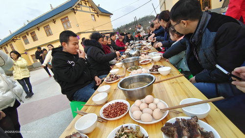 打好的糍粑被摆上了彝族同胞是最隆重、最热情的待客礼仪长桌宴,彝族同胞用彝语唱起了祝酒歌,用美妙的歌声欢迎远道而来的客人,在长桌宴上人们不仅可以一边品尝彝族的传统特色美食土豆、鸡蛋、坨子肉、鸡块等,还可以一边观看群众们自发带来的“花灯”、“中华武术”、“打钱杆”“花鼓”“猜灯谜”等精彩节目,感受浓厚的彝族文化魅力,体验不一样的民族风情。