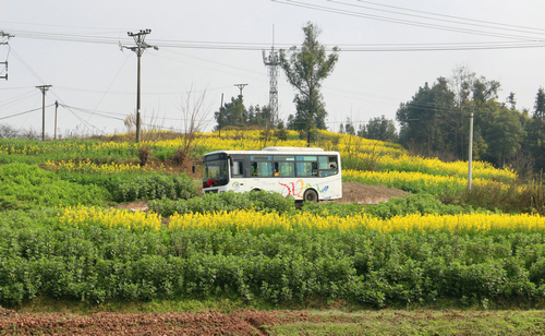 正值春期开学之际,潮河镇至王坪村的公交专线正式开通。在王坪村指定候车点,十多名中小学生有序排队,乘坐护学公交专线的第一班公交车。护学公交车行驶在王坪村通村道路上,与路旁盛开的油菜花交相辉映,形成了一道靓丽的风景线。