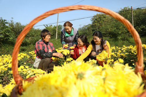| 村民正在采摘成熟的金丝皇菊 |