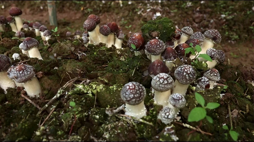 走进种植大棚,一朵朵赤松茸已破土而出,散发着浓郁芳香的味道,白色的菌柱,红色的菌帽,东一簇、西一丛,长势喜人。