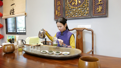 在新羽茶叶种植专业合作社,不少游客前来品一品这春的味道,茶艺师刘亿敏现场为游客们冲泡刚刚采制好的明前茶,冲泡好的明前茶茶汤嫩绿明亮,品一口,舌尖微甜,一股茶香慢慢从鼻端沁到咽喉。“为什么明前茶最好,因为茶树在去年的中秋节后会开始进入休眠,经过寒冬低温的生长,所蕴含的营养物质是最为丰富的,因为它低温的天气,大雪会把茶树上大部分的虫害给冻掉。”刘亿敏说道。
