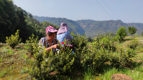 新洋村9社的村民赵学云正在指导工人采摘茶叶,在茶叶基地建设过程中,有近30名村民就尝到了产业发展的红利,赵学云就是其中之一。在家务农的他通过流转自家土地以及管护茶园等渠道增收,生活质量有了明显提升,原本已经荒废的青山变成了他致富的“金山”。