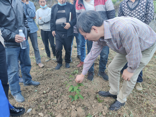 “课堂”里,李剑教种植户仔细辨认病虫害种类,再将理论知识一一对应起来,强化种植户对病虫害的辨识和防治能力。同时李剑就春季如何剪枝、修枝等管护技术进行实操示范,为种植户今后山银花的看护管理提供技术支撑。