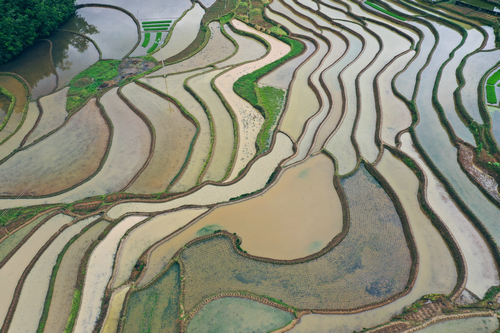 从空中看去,错落有致的梯田依山排列,一片连着一片,层层叠叠,好似一幅画卷。此时,形状各异、线条柔美的梯田里早已注满了清水,辛勤的农人们正抢抓时机,忙着在犁耙好的田块里栽插水稻。短短几十分钟,绿油油的秧苗便整齐地排列在田间,迎风挺立,生机盎然。