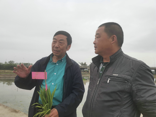 | 水稻育种专家郑家奎(左)与科技人员交流(曾佐然 摄) |
