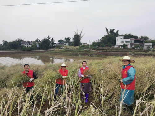 在泸县粮油现代农业产业园方洞镇陈田村粮油基地,来自镇机关干部党员志愿者服务队正在帮助村民收割油菜,但不急于将油菜运回家中,而是放在地里晾晒,转身移栽高粱秧或水稻秧。